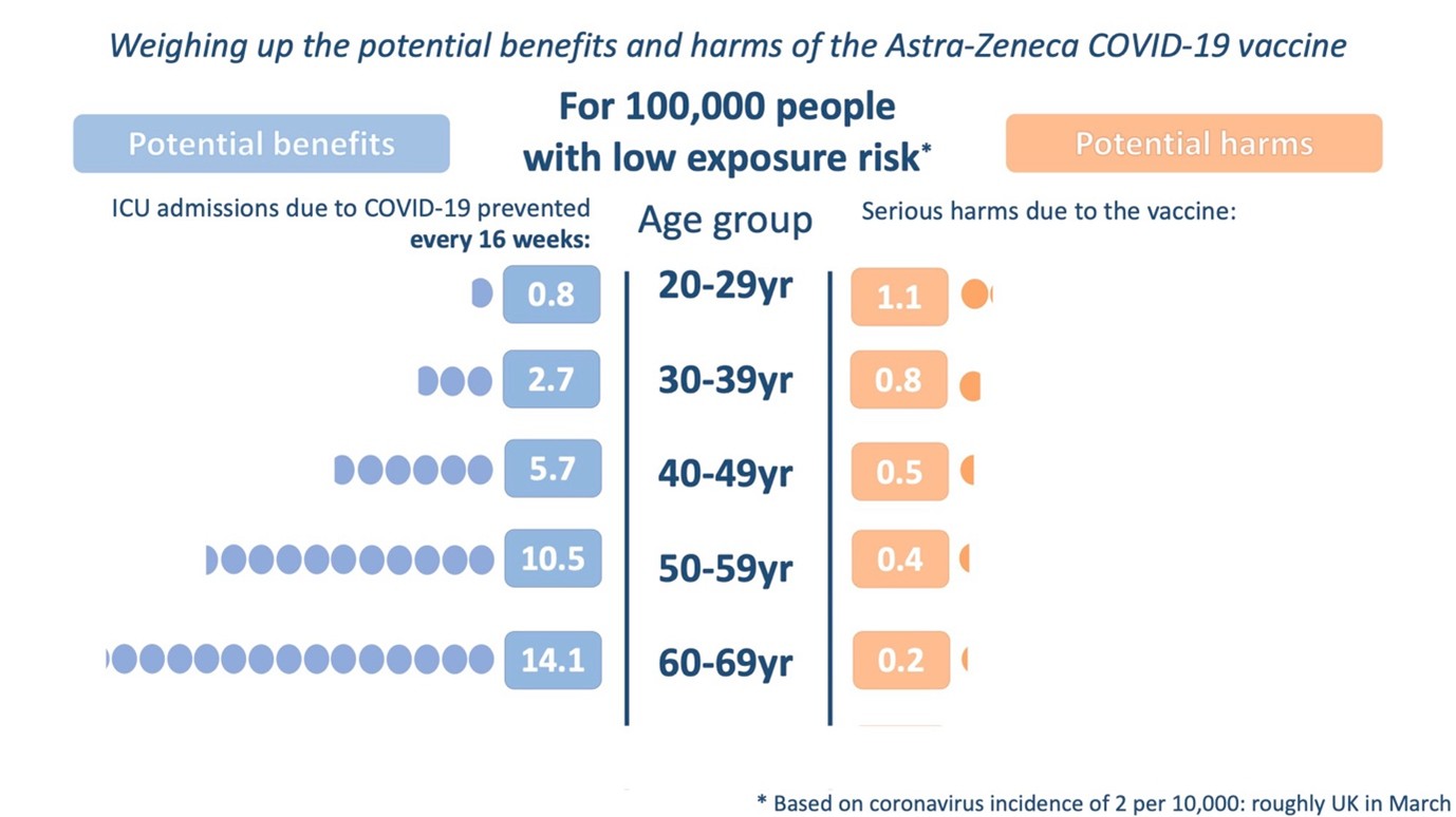 Jonathan Van-Tam, the trusted and trustworthy Deputy Chief Medical Officer, took great care explaining the infographic on the BBC broadcast, treating the audience as responsible adults, and concluded that the vaccine would no longer be recommended to those under 30 (later raised to 40). There was no push-back from the media, and gratifyingly, the graphic was widely copied.