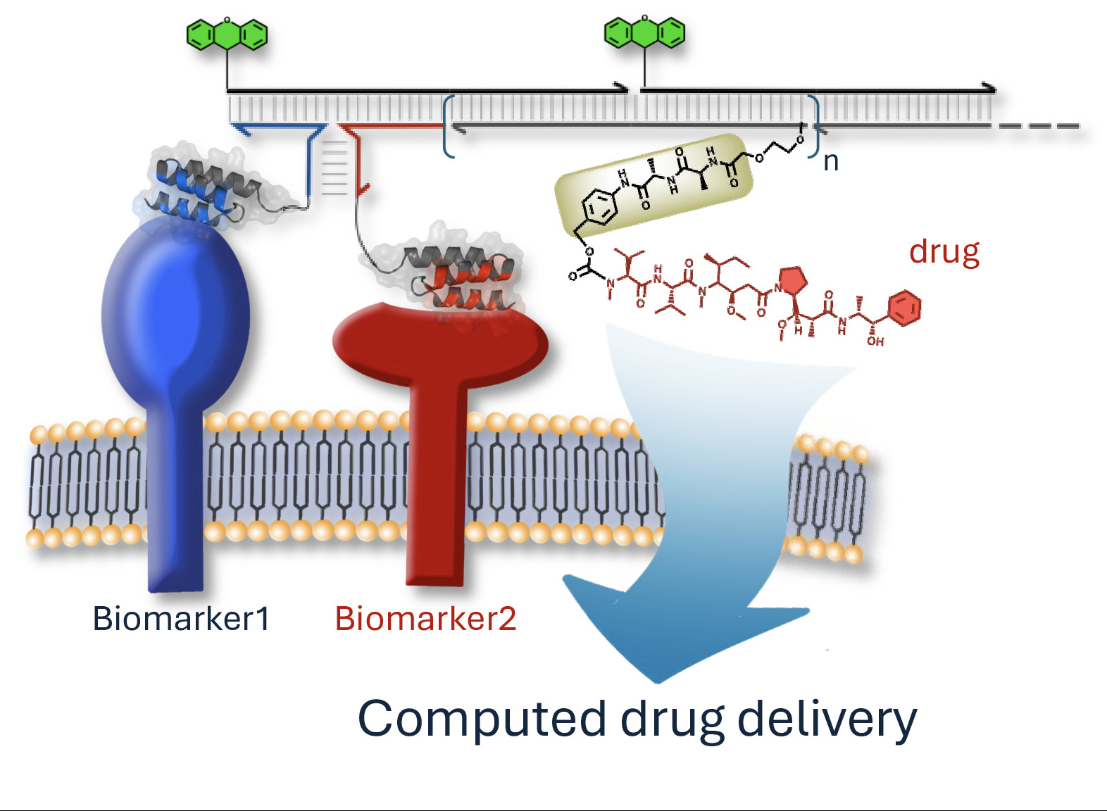Smart DNA-based drugs. When the two "detectors" simultaneously recognize biomarkers 1 (blue) and 2 (red) on the surface of a diseased cell, the DNA fragments assemble like a puzzle and trigger a chain reaction that releases the drug into the center of that cell, while sparing neighboring healthy cells as much as possible. (Adapted from Figure 1 of the original article (Chen, S. K., López-Tena, M., Russo, F. et al. DNA–drug conjugates enable logic-gated drug delivery amplified by hybridization chain reactions. Nature Biotechnology, 2026).