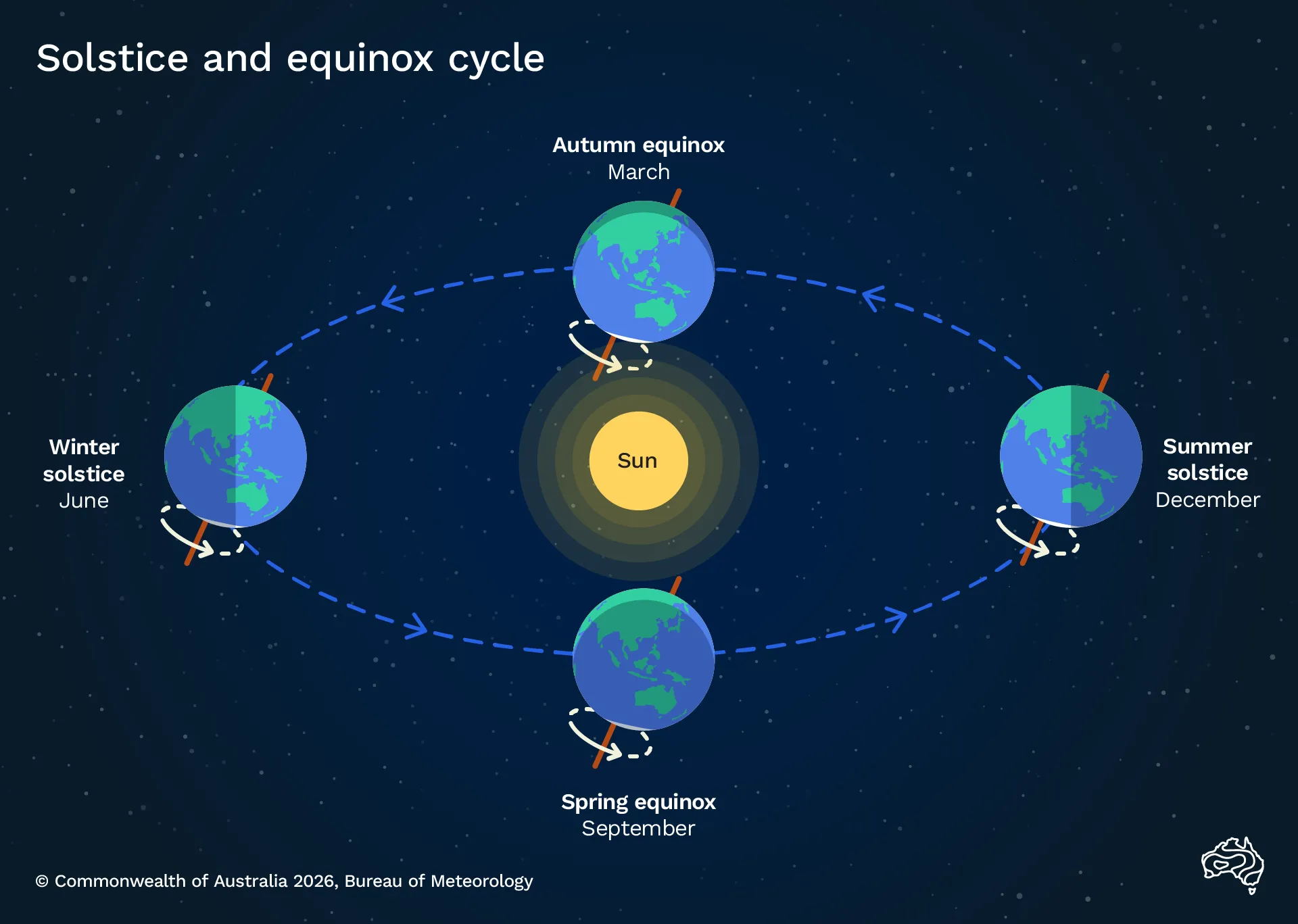 After the March equinox, the tilt of Earth's axis angles the southern hemisphere further away from the Sun. This means days in Australia become shorter than nights. The Sun continues to move north in the sky until it's over the Tropic of Cancer in late June - the southern hemisphere's winter solstice.