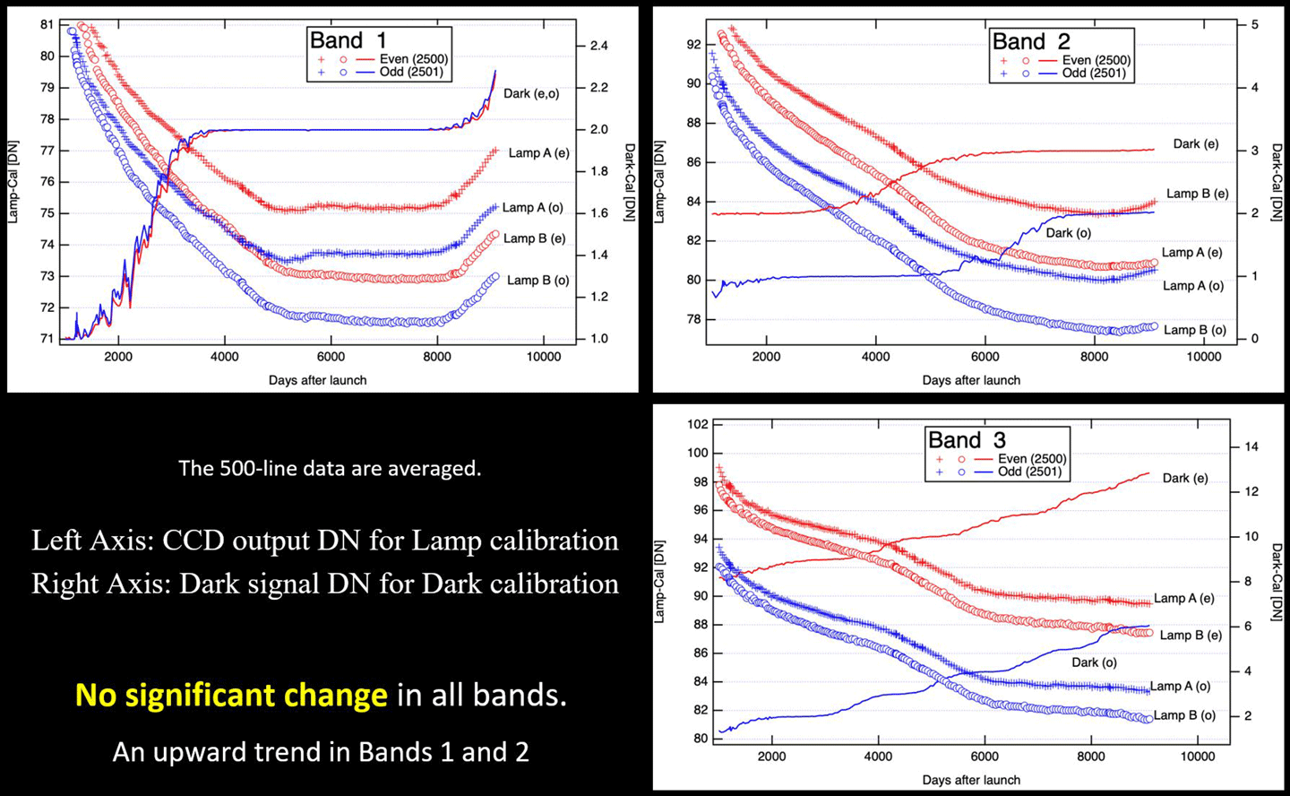 Hitomi Inada [JSS] provided a status report on the ASTER instrument. Many of the monitored components (i.e., VNIR pointing motor) are beyond their original useful life in orbit, but the aging hardware shows no signs of wearing out or a decrease in performance. She showed data that indicated that the temperature and current telemetry trends remain stable.