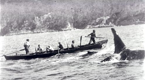 After colonists dispossessed the Thaua, Europeans began capitalising on this longstanding partnership. From around 1844, commercial whalers worked with employed Thaua and killer whales to hunt these giants. The pods of killer whales would find a prized baleen whale, herd it closer to shore and signal the whalers, who lived in the town of Eden.