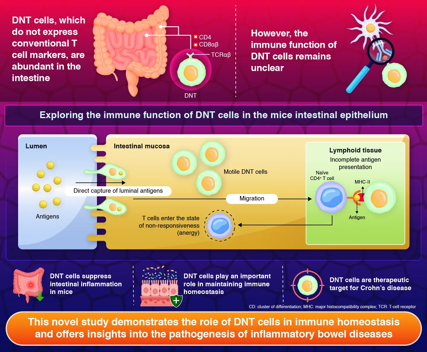 This novel study presents new insights into the mechanisms underlying intestinal inflammation and Crohn's disease, suggesting that DNT cells may be a potential therapeutic target for treating this chronic condition in the future!