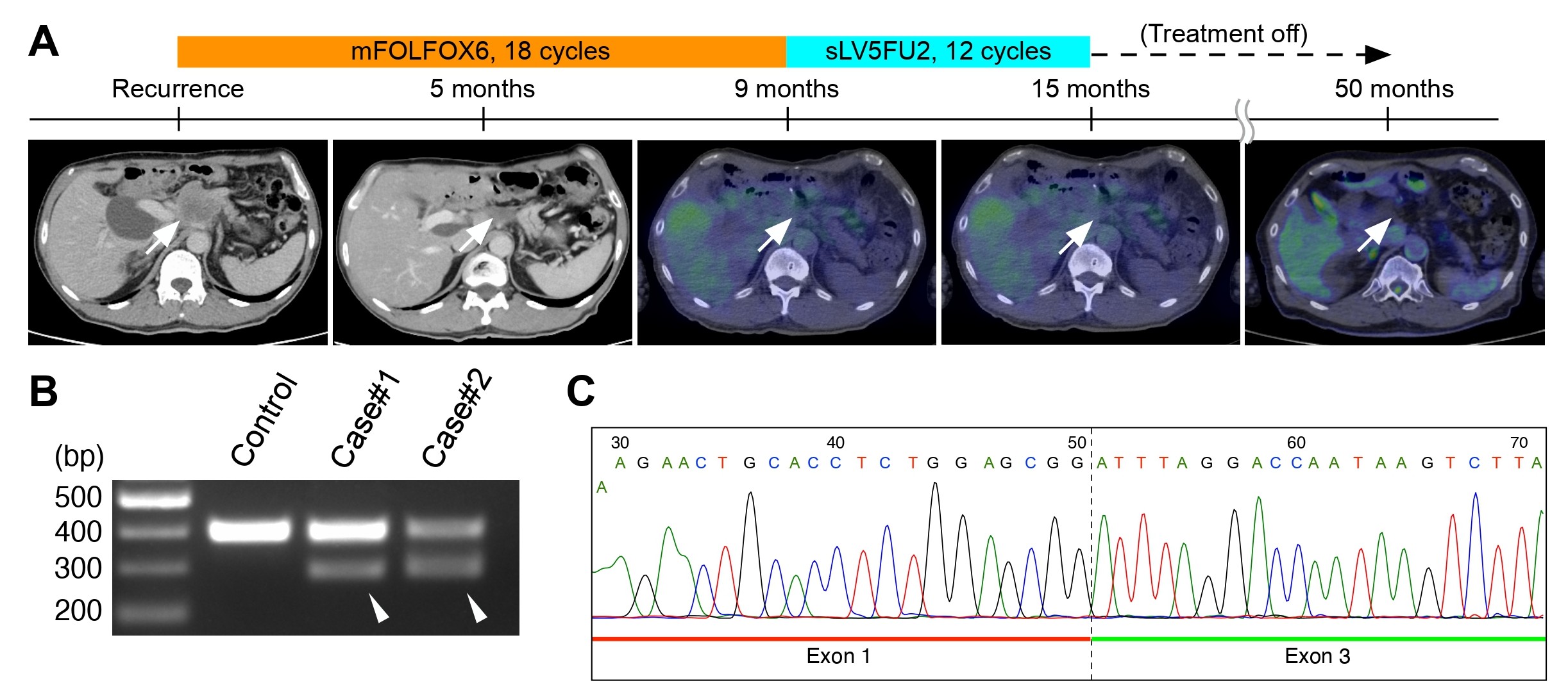 BRCA2:c.67G>C is associated with aberrant splicing and an exceptional response to platinum-based chemotherapy. (A) Clinical course and response to platinum-based chemotherapy in a patient with BRCA2:c.67G>C. (B-C) RT-PCR and Sanger sequencing demonstrate exon 2 skipping in BRCA2 mRNA amplicons corresponding to the exon-skipped transcript. (Nakahara et al. European Journal of Human Genetics. March 2, 2026)