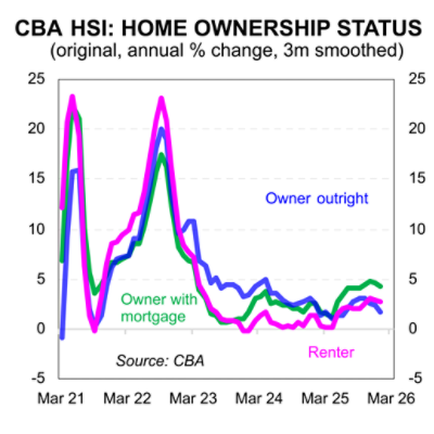 Spending growth has been strongest among households with a mortgage, with annual spending running at around 3.6 per cent, compared with more moderate growth among renters (2.6 per cent) and outright owners (1.4 per cent). While all three groups have recorded spending increases across most categories over the past year, recent data suggests growth is beginning to stabilise. Mortgagors remain the most sensitive to further interest rate increases as 2026 unfolds.