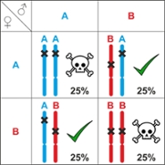 In Triturus newts, half of all offspring die. Scientists have long known that one part of their DNA - chromosome 1 - exists in two different versions. Animals need both versions to survive. During reproduction, offspring inherit one copy from each parent at random. By chance, half of the young will receive the same version twice, and those individuals do not survive.