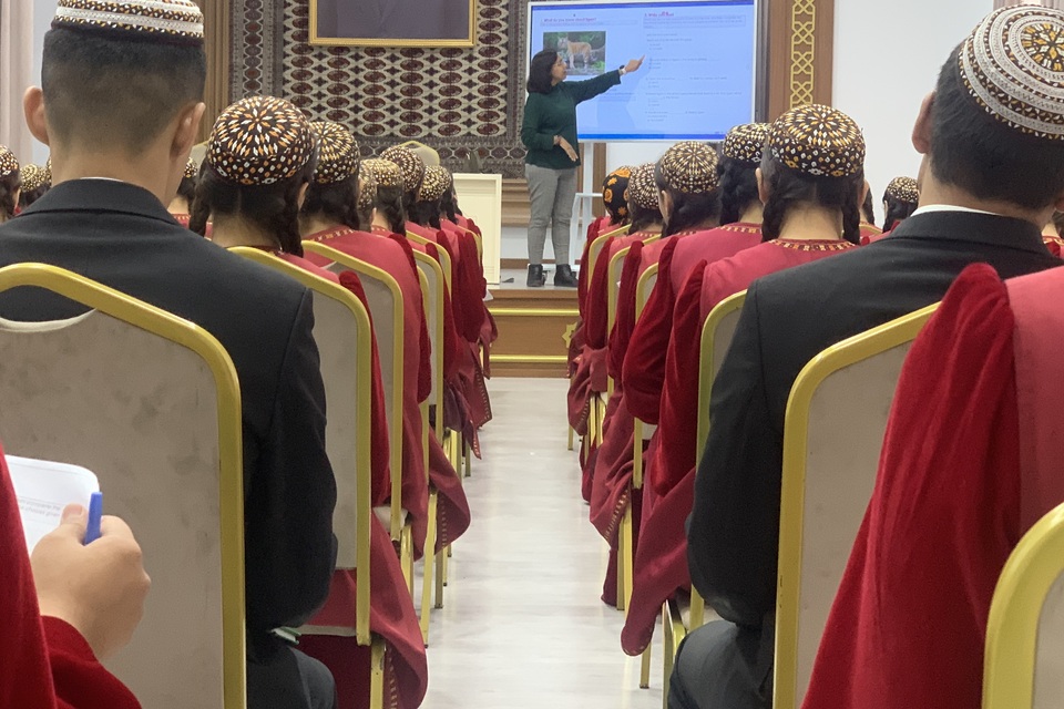 Dr Sarah Khan delivers a workshop at the Dovletmammet Azadi Turkmen National Institute of World Languages .
