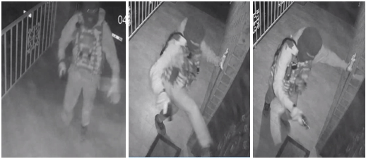 The offender, wearing a distinctive vest and what appears to be a portable radio on his right shoulder, fired shots into the front door and kicked it making demands for someone to come out.