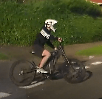 The rider is perceived to be Caucasian, approximately 160cm tall, medium build, black hair and was wearing a dark-coloured hooded top that says 'play for keeps' and a black and white helmet.