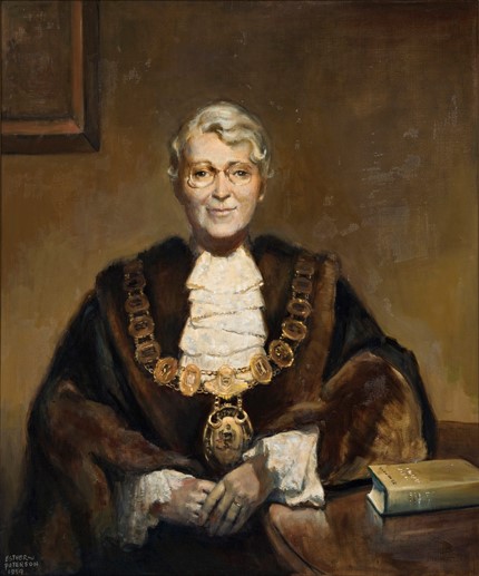 - Esther Paterson's portrait of South Melbourne Councillor and Mayor Dr Janet Cooper in her mayoral robes. These works exemplify the breadth of women's lives and activity in our community, the doctors, councillors, artists, designers and more, and the depth of stories behind people who made and wore these outfits.
