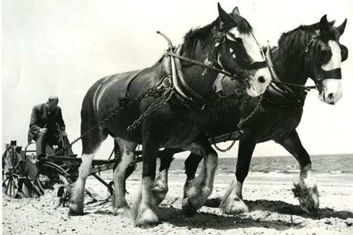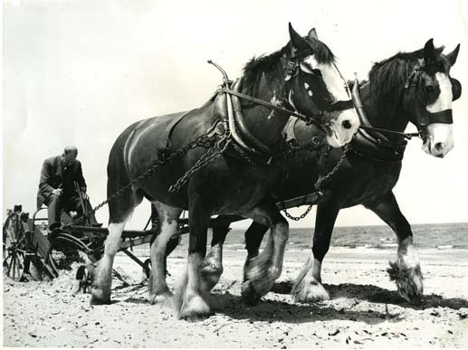 Two Clydesdale horses dragging a plough which is digging into the sand of South Melbourne Beach, 1960s, sm0884, Port Phillip City Collection