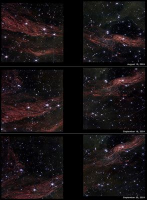 The most obvious features in the Webb images are tightly packed sheets. These filaments show structures on remarkably small scales of about 400 astronomical units, or less than one-hundredth of a light-year. (An astronomical unit, or AU, is the average Earth-Sun distance. Neptune's orbit is 60 AU in diameter.)