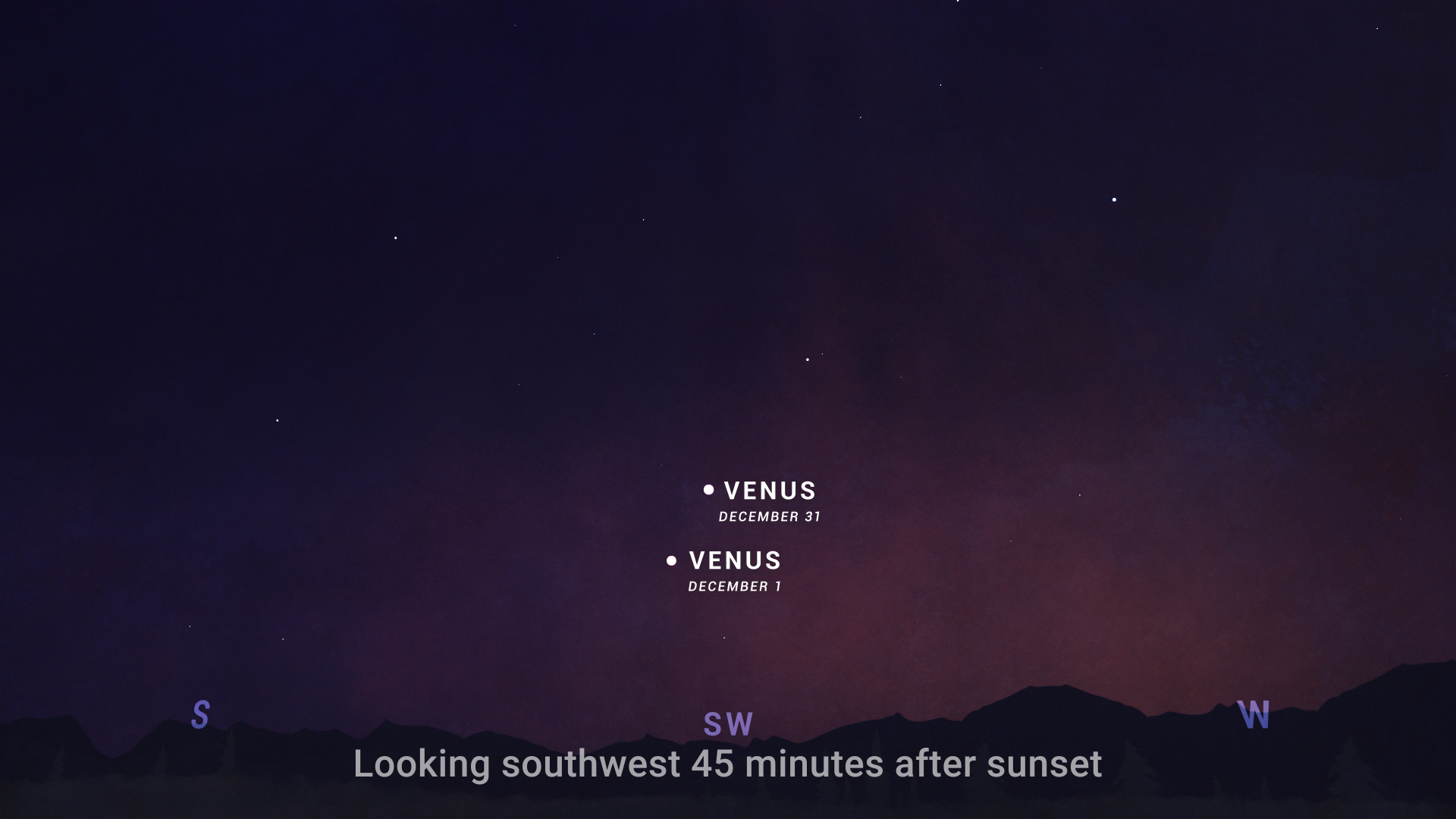 December 3-5 - Venus and the Moon: Look southwest after sunset to see a beautiful pairing. On December 4, a slim crescent Moon will sit directly below Venus.