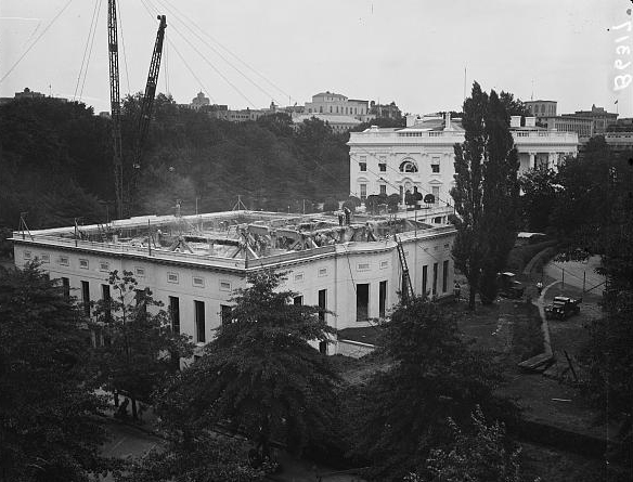 - In 1934, President Franklin D. Roosevelt overhauled the West Wing, adding a second floor, a larger basement, and a swimming pool, and relocating the Oval Office to its current location; in 1942, President Roosevelt constructed the East Wing.