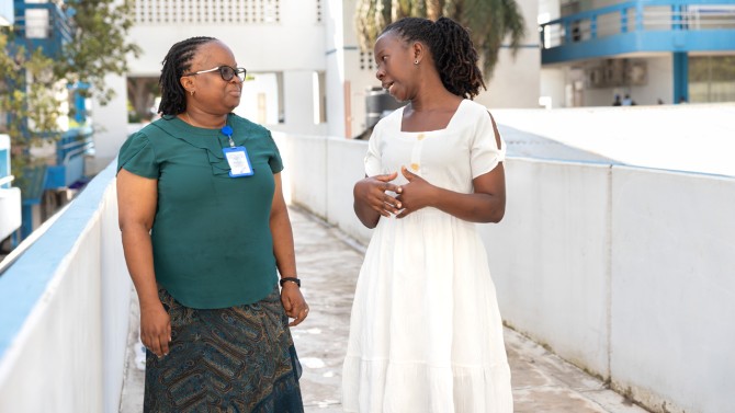 At left, Dr. Adolphine Hokororo, M.S. '14, a pediatrician and clinical epidemiologist at Weill Bugando School of Medicine, chats with Anea Isaka Lizonga, director of the gender desk at Catholic University of Health and Allied Sciences.